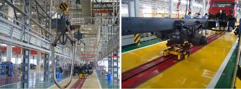 该项目由总装配线和车身分装线组成。总装配线用于整车底盘装配及检查下线,它由两部分组成,前部分采用单链牵引小车形式,即可调台车间距垂直返回式地拖链,后部分采用双板链形式。总装线产品上线为起吊设备吊装上线,产品下线为驾驶员驾驶产品下线。产品在总装配线上由两台至四台台车支撑运行,完成驾驶室、轮胎、车厢等的装配作业。为了使产品在双行道板链和地拖链之间自动平滑过渡,在地拖链的末端与双行道板链重叠段设置向下的缓坡。