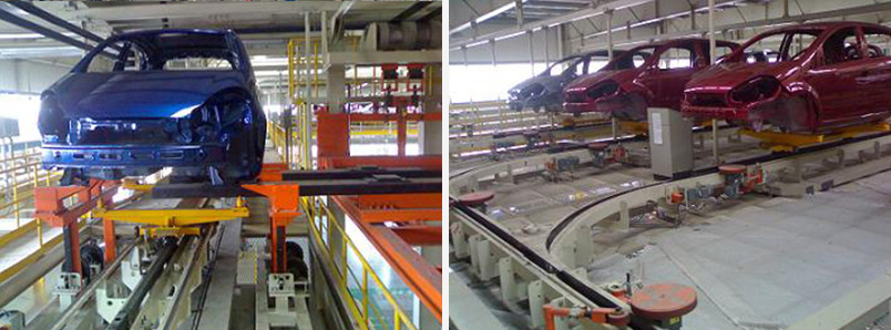 该系统采用空中、地面摩擦线,主要用于:P11/P12、B13的白车身骨架输送,简称为转运线,P11/P12/B13/H13/S22/A18白车身整车焊装到涂装下件点的输送和存储,简称存储线。该摩擦线能满足前六种车型的同时共线生产输送用。