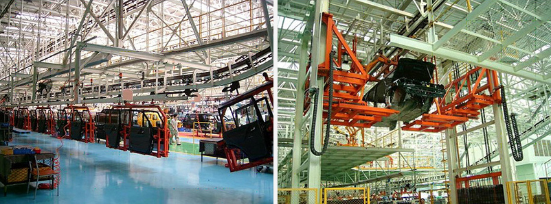 长丰汽车公司永州基地新总装车间输送系统是为了适应不断扩大的产量而新建的,批量年产5万辆,分底盘线、内饰线、车门线以及上下转挂用的升降机及随动装置,车身底盘装配输送机系统是YTJ6型号的输送机组成,共由一条快链和一条慢链组成,工艺速度1-2.5m/min,链条长度约780米,小车积放长度5300mm,工位间距6128mm,小车组采用6车组型式,小车数27套。内饰线采用YTJ6型号的输送机,共由一条快链和一条慢链组成,工艺速度1-2.5m/min,链条长度约500米,小车积放长度5300mm,工位间距6128mm,小车组采用6车组型式,小车数24套。车门线采用YTJ4型号的输送机,共由两条快链和一条慢链组成,工艺速度1-2.5m/min,链条长度约1200米,小车积放长度3500mm,工位间距4300mm,小车组采用3车组型式,小车数85套。