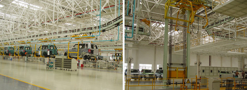 该系统主要由以下三部分组成:漆后车身输送线、内装饰线、底盘线。漆后车身输送线主要用于将涂装好的车身储存及转运,线体采用滑撬输送机,涂装车间的旋转滚床将编组后的漆后车身送入过廊上的双链输送机。车身在过廊上储存和输送,在转挂滚床上定位,经液压举升叉式移栽机将车身转移到旋转滚床上,在通过叉式移栽升降机将车身落到内装饰线的随动装置上。内装饰线采用版式输送机,从漆后车身输送线通过随动装置接漆后车身,再将内饰后的车身送到底盘线。底盘线包括:底盘装配线、车门分装线、车轮分装线、仪表台分装线、前悬分装线、后悬分装线、发动机分装线、座椅分装线、最终装配线等。控制系统采用五套分控制系统,系统一控制漆后车身输送线及内实现转接升降设备;系统二控制内饰车门线及仪表分装线;系统三控制底盘、轮胎、座椅线、发动机和前后悬分装线;系统四控制最终装配线、车身转运及OK线;系统五控制外观检测线。