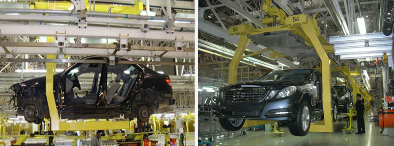 本项目是在北京奔驰现有的克莱斯勒汽车总装车间整合设备,生产奔驰E级车和C级车。在地面高度新安装ASD输送线。使用空滑撬升降机将车身降到地面高度。空滑撬送入滚床,在0m时,通过链式移行机输送到北侧新的ASD输送线。再通过移行机、滚床和升降机,把车身送入+3.3米的C型吊具中。车身在总装滑撬上,完成操作后,车身向左或向右进入横移保护工位(速度12min/min)。为了适应两种车型的自动转换。在线安装支点自动转换装置,按照不同车型进行转换。在底盘吊具和橇体上车身转挂工位,设置举升台和浮动装置,并经定位装置进行准确定位,保证转挂的准确性。车门线为了适应新车型,对所有支撑和安装结构进行改造更新,保证车门线适应新车型的需要。