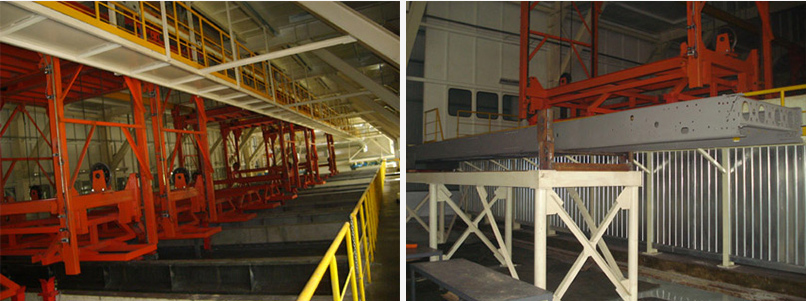 The conveying system is mainly used for the upper part of the frame, pre-treatment, electrophoresis, drying, strong cooling and lower parts. The workpiece is placed on the bracket by the electric single-girder crane, and the program-controlled driving runs to the top of the workpiece. The workpiece is manually hung on the hanger for pre-treatment and electrophoresis. After the processing, the workpiece is placed on the transfer vehicle and transported to the synchronization. The upper end of the double-chain conveyor hangs the workpiece onto the hook of the double-chain conveyor for drying and strong cooling. The system has a total of 7 program-controlled vehicles, which complete the degreasing, cleaning, surface adjustment, phosphating, cathodic electrophoresis, UF liquid cleaning and other processes. The system adopts the program-controlled driving developed by the company, the production program: 40,000 frames/year; the production cycle: 6min; the workpiece dimensions: 11565×1080×800mm; the quality of each hanging: 2800kg.