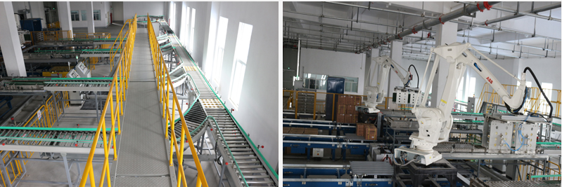 The project consists of the system that from the end of the production lines in each workshop (including 4 production lines on first floor and 4 production lines on the second floor) to the robot palletizing area on the second floor of stereo warehouse, carton delivery system, robot palletizing system, pre-warehouse pallet delivery system, shelf system, stacker system, pallet, WCS electrical control system, WMS management to system and network communication system.