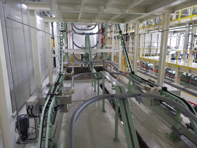 2、 浸槽垂直爬坡角度大(45°),入槽速度快,排气好。缩短了前处理和电泳设备的长度。降低了前处理设备成本。