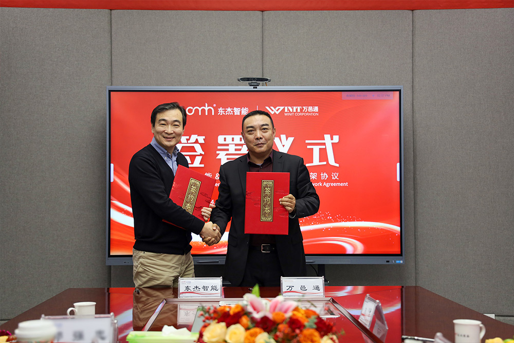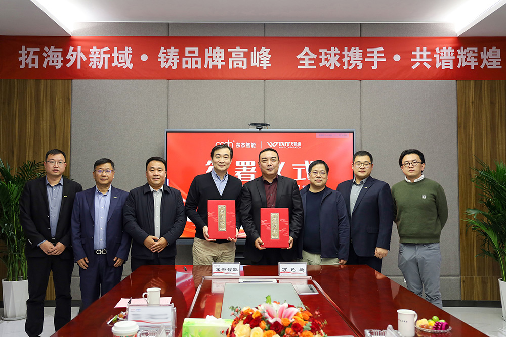 签署仪式上,双方代表在热烈的掌声中完成了合同签署,并合影留念。这次签署仪式的成功举行,标志着东杰智能与万邑通的合作进入新阶段,也为双方未来在更多领域的合作奠定了坚实的基础。