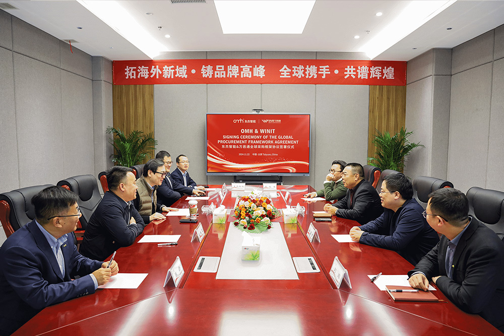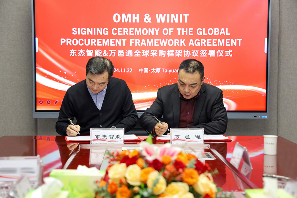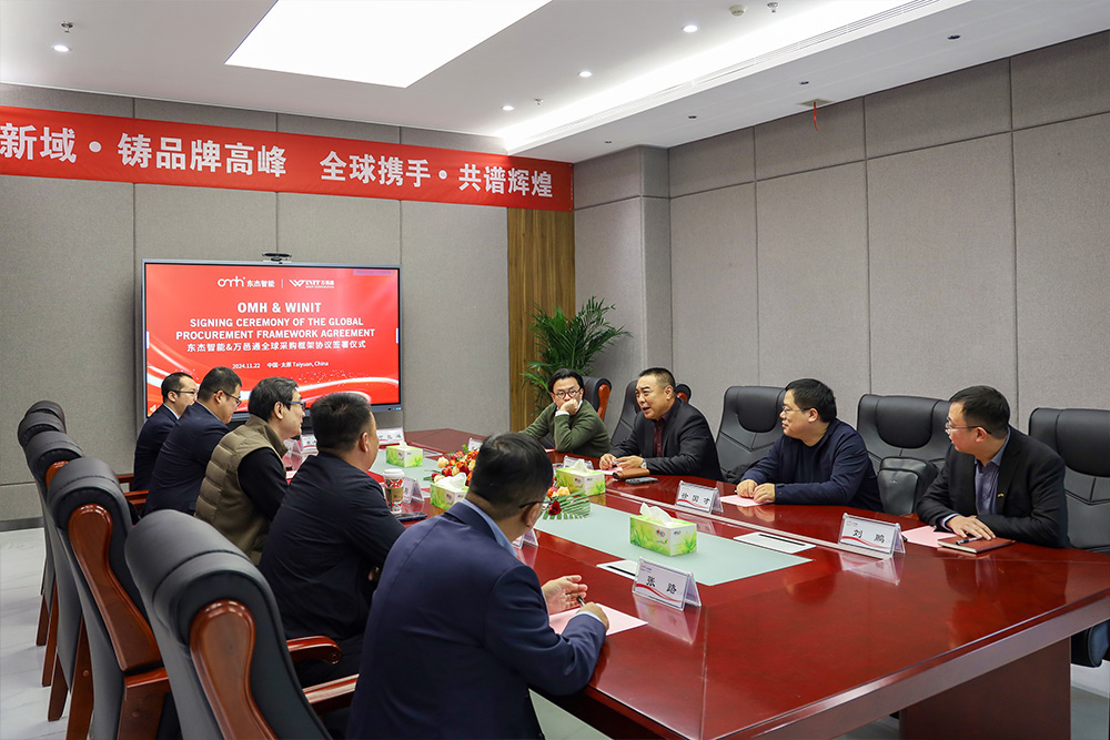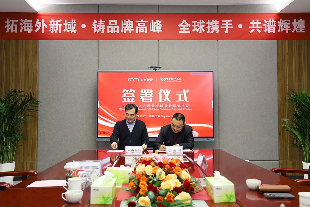 2024年11月22日,东杰智能&万邑通全球采购框架协议签署仪式在东杰智能总部成功举行,合同总金额近7亿元。仪式由东杰智能副总裁郭强忠主持,出席仪式的有:万邑通董事长兼CEO陈宏伟、信息总经理徐国才,东杰智能董事长娄刚、总裁王振国、董事长助理陈晨、财务总监张路、副总裁刘鹏。此次协议的签署,标志着双方在全球物流领域的合作迈向新高度。